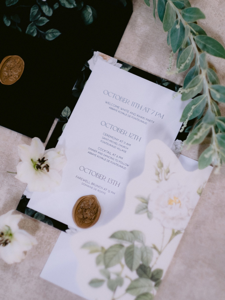 Le dîner de ce mariage couture dans l’Abbaye Royale était servis au sein d’une grande salle voutée en pierre blanche, que nous avons mis en lumière pour sublimer l’architecture. Trois grandes tablées accueillait les convives, avec des chaises design noires de chez Kartell. Ainsi nous apportions de la modernité et du caractère au design. L’art de la table raffiné et moderne en blanc, doré, lin beige contrastait avec la papeterie dans un motif de roses anglaises blanches et vertes sur fond noir, des bougeoirs et photophores noirs et doré, très hauts pour jouer avec la grandeur de cette salle.